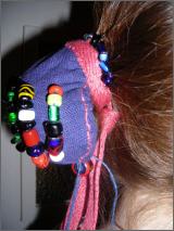 Bei den fünf Reihen mit Glasperlen handelt es sich um Replikate von wikingerzeitlichen Perlen. Für meine Wikingerdarstellungen habe ich sie übernommen, weil auch bei den Walküren-Funden eine Art Haardutt zu erkennen ist. Außerdem findet man auch auf vielen Goldgubben Frauenabbildung mit Haarknoten mit langen Bändern. Ob es sich dabei um Haarsträhnen, Zöpfe oder Stoffbänder handelt, ist nicht eindeutig zu klären.