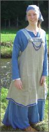Meine Darstellung als Wikingerin von der Insel Bornholm ist in der Übergangszeit zwischen Vendel- und Wikingerzeit angelegt. Ich trage ein leichtes Gewand aus Indigogefärbter Schurwolle in Diamantköper-Struktur. Darüber trage ich eine Schürze aus naturbelassenen, ungebleichtem Leinen, ebenfalls in Diamantköper-Struktur. Bei der Schürze handelt es sich um eine Rockschürze (auch "Schürzenkleid" genannt), welche mit verschiedenen Brettchengeweben aus Seide verziert ist. Als Kopfbedeckung dient mir ein einfaches dreieckiges Kopftuch oder die Sächsische Haube.