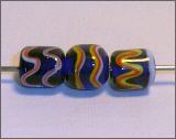 Vielfach gibt auch Perlen mit blauen Grundkörpern, die eine vielfarbige Fadenzier aufwiesen. Verwandte Perlentypen findet man vor allem im Ribe.