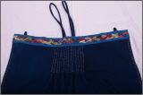 Als Stickgrund habe ich einen feinen indigo-gefärbten Wollstoff verwendet. Als Garn diente mir Seidengarn. Für die Umrandungen habe ich den Stepp- oder Rückstich, für das Aufüllen Plattstich eingesetzt. Nach etwa 80 Stunden war das Stück vollendet und konnte auf die Schürze genäht werden.