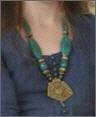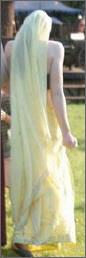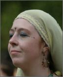 Gewöhnlich trage ich einen sehr langen Schleier, der bis an meine Fersen reicht. Dies entspricht nicht dem gezeigten Kopfputz. Allerdings ist diese Trageweise typisch für die vornehme Bevölkerung Persiens dieser Zeit. Diese langen Schleier können nach vorne über die Schultern gelegt werden und umgeben so fast den gesamten Körper. Sie sind die Vorläufer der tradionellen afganischen Burka. Die große Halskette beruht auf traditionellen Vorlagen aus dem heutigen Iran. Um die Gesamtdarstellung perfekt zu machen, trage ich zahlreiche Armreife, entsprechende Ohrringe und trage zeitgemäße Schminke auf. Alle nachfolgenden Bilder wurden mir freundlicherweise von www.seelenfaengerin.de zu Verfügung gestellt.