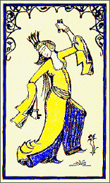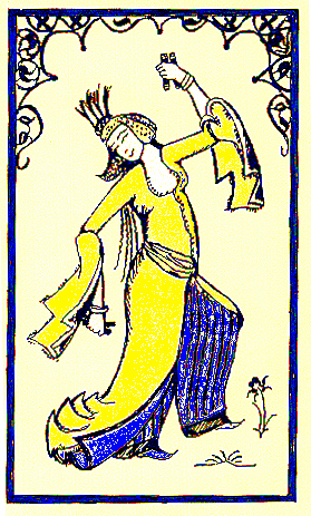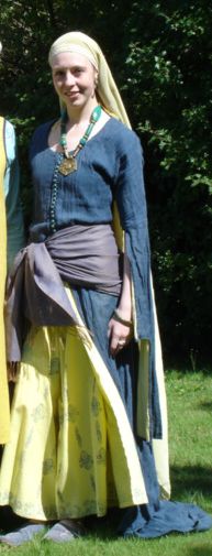 Meine Darstellung entspricht einer persischen Tempeltänzerin des 14. Jahrhundert. Als Vorlage diente mir eine Miniatur aus dem Buch der Königinnen. Die abgebildete Tänzerin trägt eine Wickelhose mit blauen und weißen Streifen und einen gelben Kaftan, der blau gefüttert ist. Auffällig ist die seltsam gezackte Ärmelform. Solche hängenden Ärmel mit verschiedenen Randformen findet man jedoch auf diversen Abbildungen dieser Zeit.