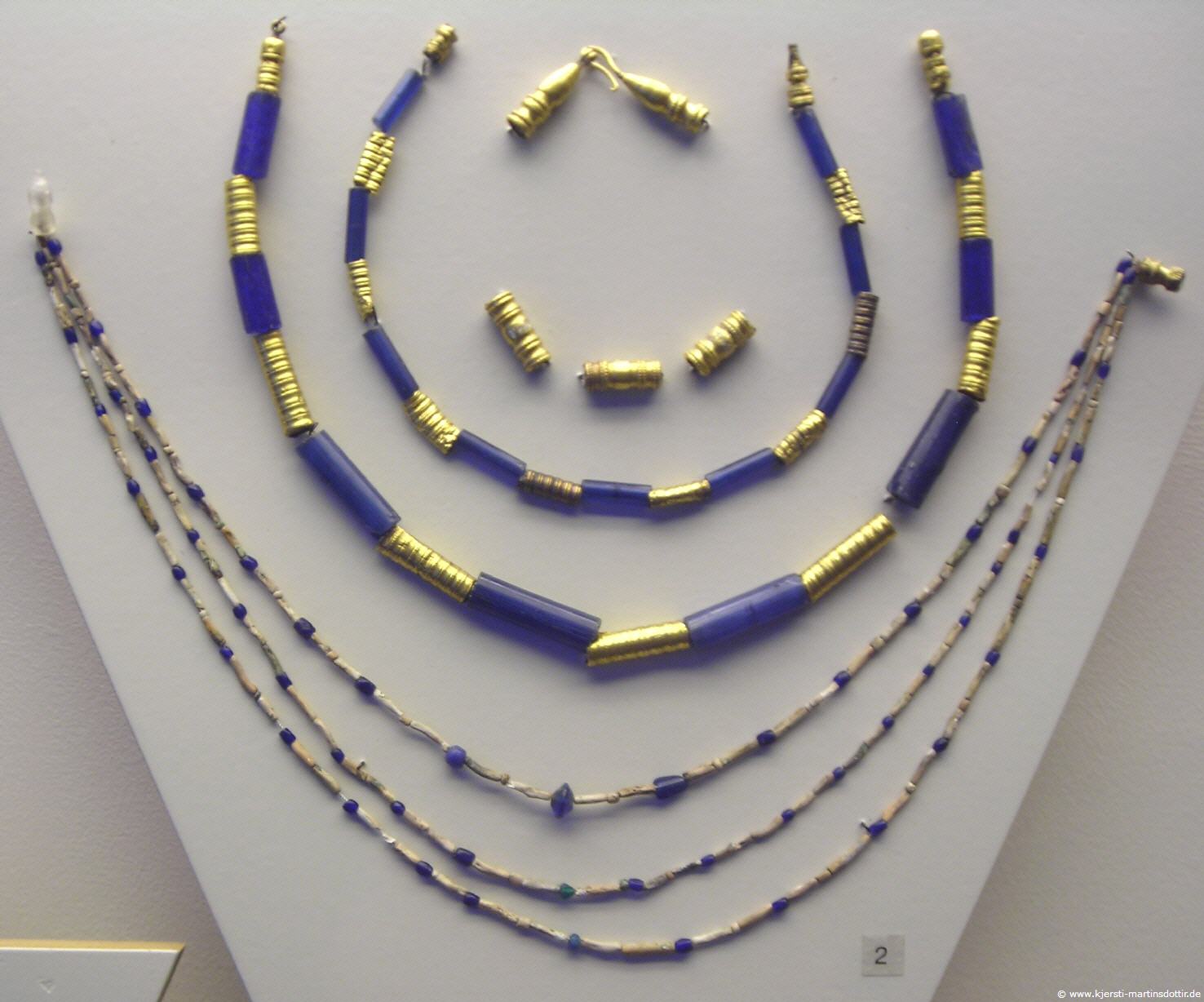 Alle germanischen Stämme hatten ein Faible für bunte Glasperlen, die sie fleißig aus dem Römischen Reich importierten. Es war ein Prestige Glasperlenketten zu tragen, welches alle Bevölkerungsschichten und Altersgruppen durchdrang. Hals- und Fibelketten gab es sowohl bei Männer wie bei Frauen. Ab Mitte der römischen Kaiserzeit treten häufig auch Bernsteinketten auf.